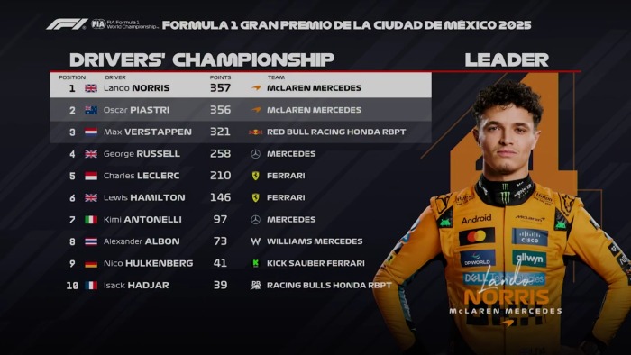Sementara rekan setimnya, Oscar Piastri finish pada posisi kelima. Dengan begitu, hasil dari Mexico City Grandprix ini membawa Norris memimpin klasmen kejuaraan untuk pertamakalinya sejak akhir pekan Grand Prix Arab Saudi pada April lalu, meskipun hanya unggul satu poin dari rekan setimnya.
