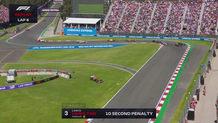 Hukuman 10 detik ini didapatkan setelah Hamilton mendapatkan keuntungan dengan keluar dari lintasan setelah pertarungan sengit dengan Max Verstappen pada lap 6.