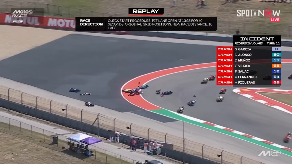 Joe Roberts dan pesaing gelar juara Dani Holgado bertabrakan di Tikungan 1 sebelum terjadi insiden mengerikan yang melibatkan beberapa motor dan memaksa bendera merah dikibarkan. Insiden tersebut sedikit merusak balapan yang semula seru dan kompetitif, yang tentunya telah mengguncang klasemen Moto2.